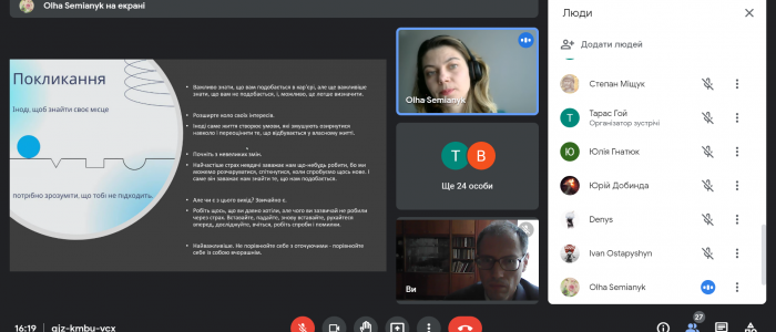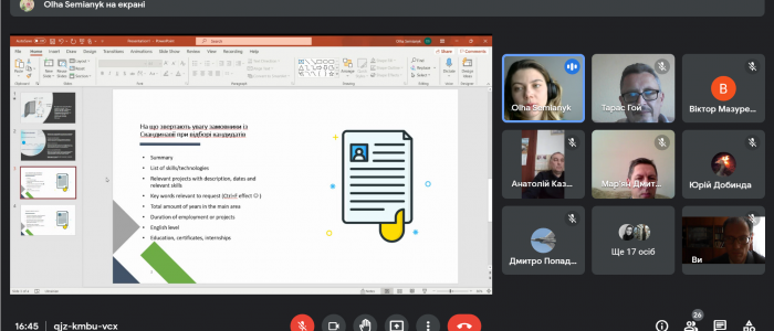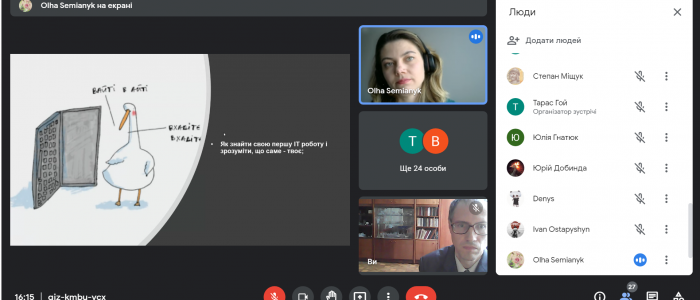 26 жовтня 2021 року відбулась онлайн-зустріч студентів освітніх програм “Прикладна математика” та “Комп’ютерне моделювання та технології програмування” з Ольгою Сем’яник (Delivery manager, 7 років в ІТ). Спікер розповіла багато цікавих історій з власного досвіду про те, як знайти свою першу ІТ роботу, як презентувати себе за допомогою хорошого CV (tips & tricks), як сприймати невдачі під час особистісного росту, і чому помилки – це важливо.