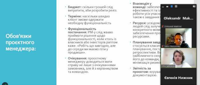 Ольга Сем’яник розповіла про роботу проєктного менеджера і навела ряд цікавих історій з власного досвіду про організацію роботи групи розробників програмного забезпечення. Після доповіді студенти мали можливість задати питання і отримати на них відповіді.