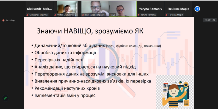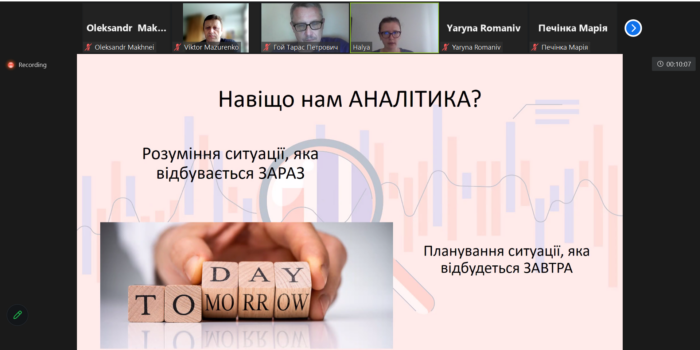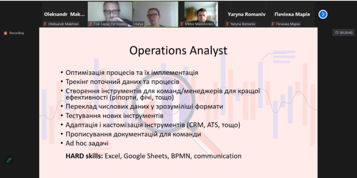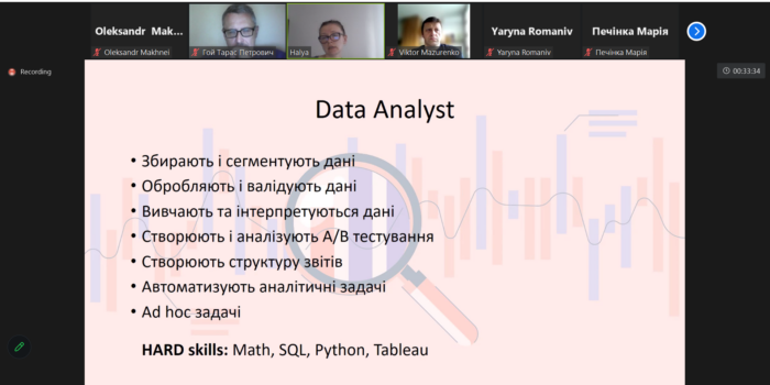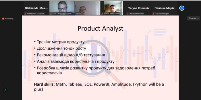 Галина Хімейчук розповіла про роботу операційного аналітика, аналітика даних і аналітика продукту, завдання, які вони мають розв’язувати, потрібні для успішної діяльності знання, здібності і навички. Після доповіді присутні мали можливість задати питання і отримати на них відповіді.