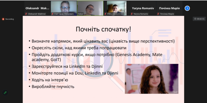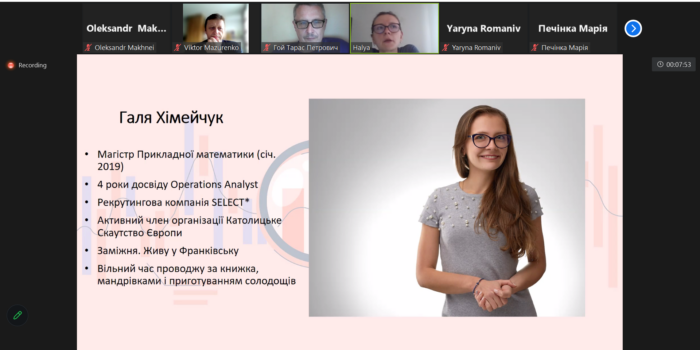 7 червня 2023 року відбулась онлайн-зустріч студентів освітніх програм “Прикладна математика” і “Комп’ютерне моделювання та технології програмування” з операційним аналітиком компанії Select* Галиною Хімейчук.