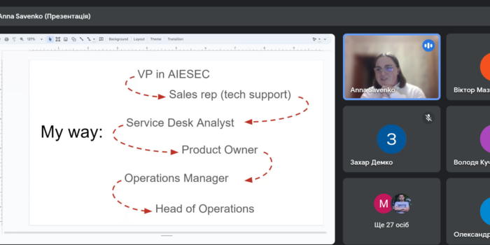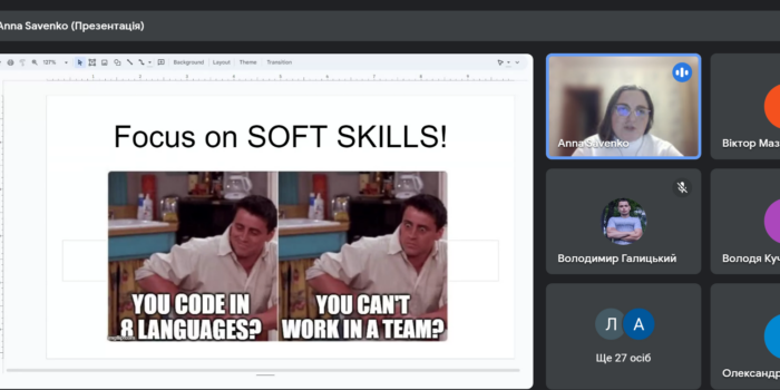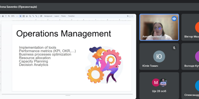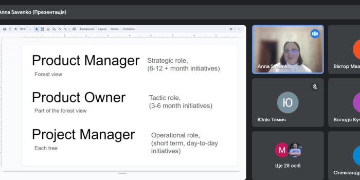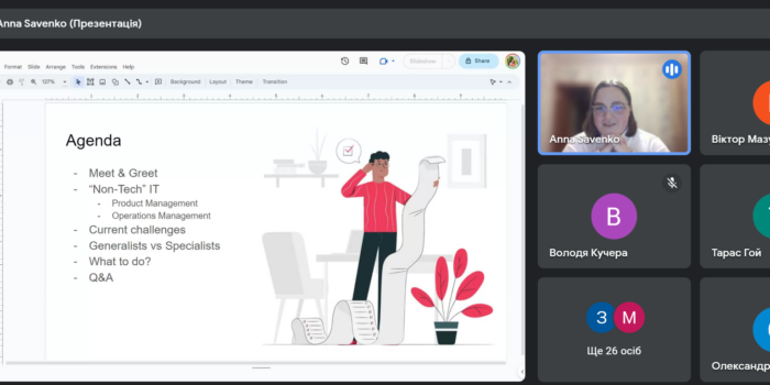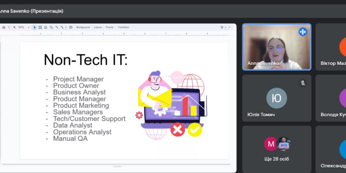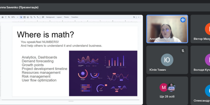 Анна Савенко розповіла про роботу операційного аналітика, проєктного менеджера, менеджера продукту, завдання, які вони мають розв’язувати, потрібні для успішної діяльності знання, здібності і навички. На доповіді йшлось, зокрема, про те, як знайти свою першу ІТ роботу, як презентувати себе з допомогою доброго резюме, було відзначено типові помилки, яких припускаються недосвідчені випускники при пошуку роботи в IT-галузі. Також було відзначено зв’язок прикладної математики з програмуванням. Після доповіді присутні мали можливість задати питання і отримати на них відповіді.