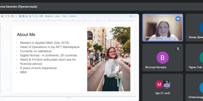 23 листопада 2023 року відбулась онлайн-зустріч студентів освітніх програм “Прикладна математика” і “Комп’ютерне моделювання та технології програмування” з операційним аналітиком компанії Nifty Tech Анною Савенко.
